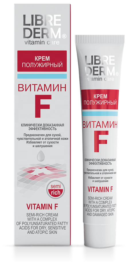 Дефицит влаги и себума в роговом слое приводит к повреждению защитного барьера кожи, и, как следствие, появляется ощущение стянутости, шелушение, повышенная реактивность, зуд, мелкие поверхностные морщинки, потеря упругости кожи. Также характерно развитие процесса утолщения кожи. Витамин F крем полужирный с комплексом полиненасыщенных жирных кислот и витаминным концентратом F+А+Е природного происхождения, рекомендован для участков тела с утолщённой кожей: ладони, коленные и локтевые сгибы. Нормализует основные параметры сухой кожи: повышает уровень её увлажненности, восстанавливает целостность гидролипидного барьера, снижает потерю влаги, снимает повышенную чувствительность. Устраняет ощущение стянутости, возвращает коже комфорт, предупреждает образование сухости и трещин. Витамин F крем полужирный прошел клиническое тестирование, где показал высокую эффективность в увеличении гидратации и нормализации уровня жирности кожи. Рекомендован ведущими дерматологами как при ежедневном самостоятельном уходе, так и в сопровождении терапии атопического дерматита.