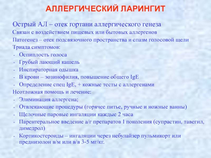 Аллергический отек гортани — это острая аллергическая реакция, характеризующаяся быстрым отеком тканей гортани и верхних дыхательных путей. Это потенциально опасное для жизни состояние, требующее экстренной медицинской помощи.