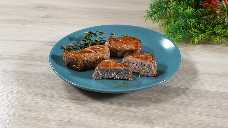 Смешайте все ингредиенты для соуса. Нарежьте филе на медальоны, обмажьте соусом и оставьте мариноваться на 2 часа. Обжарьте мясо на сковороде-гриль по 3-4 минуты с каждой стороны.