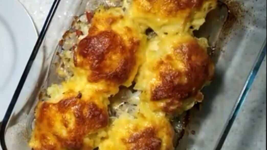 - Выложить половину картофельного пюре в форму, сверху распределить фарш, накрыть оставшимся пюре.