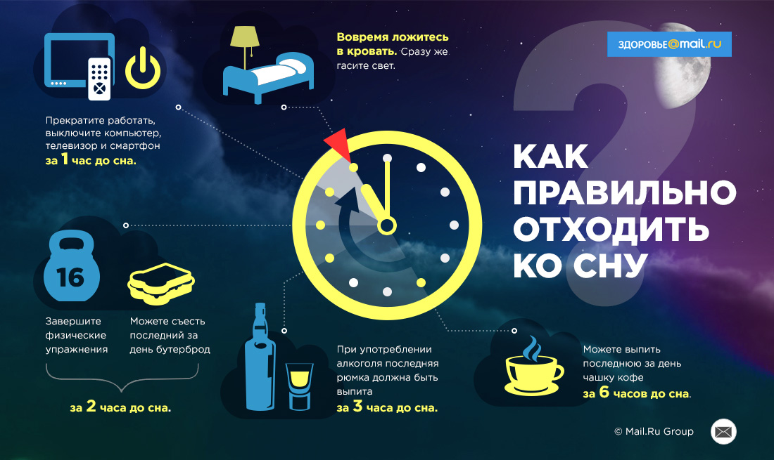 Лучше всего засыпать и просыпаться в одно время, советует Роман Бузунов. А еще лучше – создать вечерний «сонный ритуал»: каждый день выполняйте перед сном одни и те же действия, например, слушайте спокойную музыку или принимайте теплую ванну. Для организма это станет привычкой и сигналом ко сну.