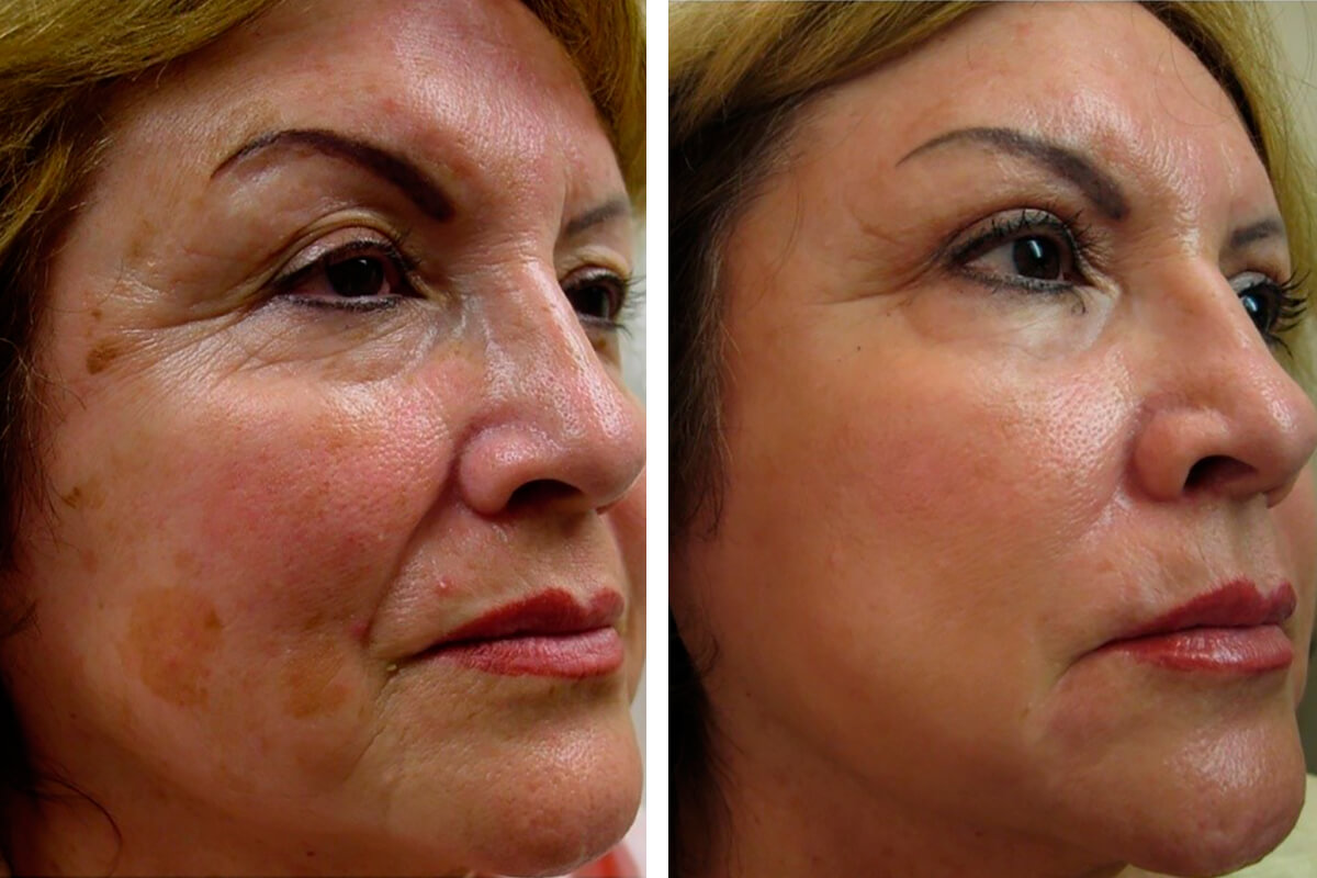 - гиперпигментация (пигментные пятна), неровный тон и рельеф кожи.