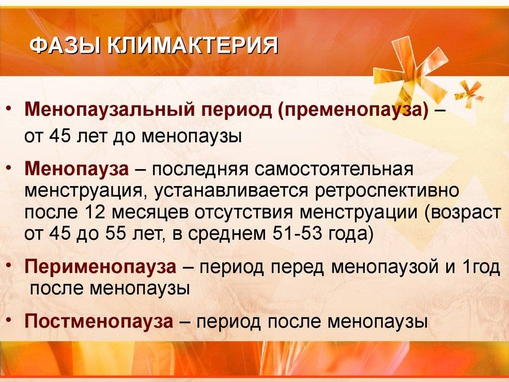 Он медленный и состоит из трех стадий:- Перименопауза . Эта фаза обычно начинается за несколько лет до менопаузы, когда ваши яичники постепенно вырабатывают меньше эстрогена. Перименопауза длится до менопаузы, когда ваши яичники перестают выделять яйцеклетки. В последние 1-2 года этой стадии уровень эстрогена падает быстрее. У многих женщин есть симптомы менопаузы.
