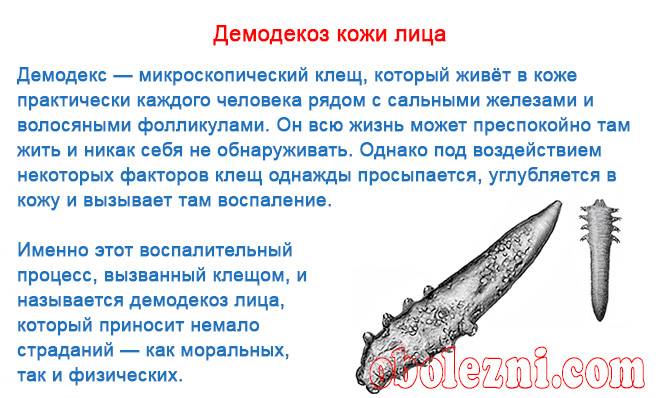 Как известно, заболевания такого вида сильно ударяют по состоянию организма. Многие из болезней являются смертельными, становятся причиной ранней смерти человека. Неудивительно, что на фоне таких проблем с организмом может проявиться демодекоз на лице или на другой части тела;