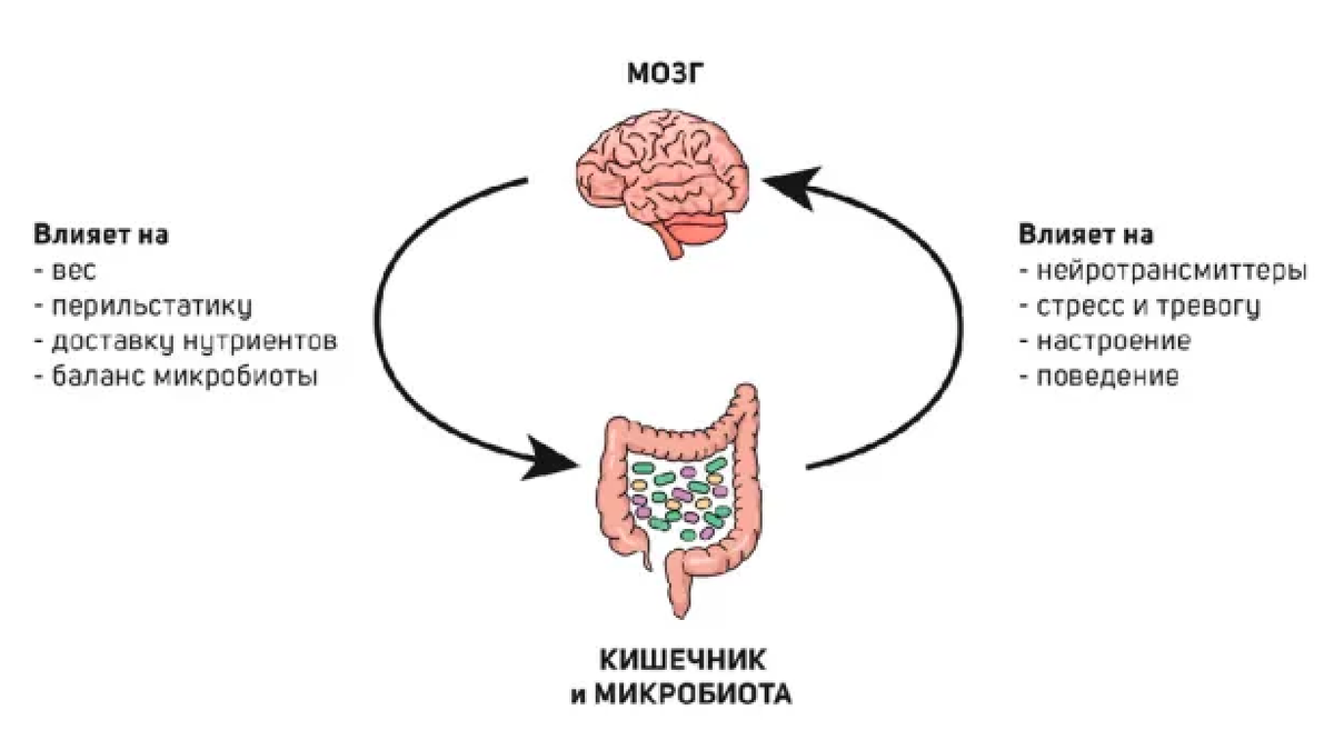 Исследования показывают, что между кишечником и мозгом существует двусторонняя связь, получившая название «ось микробиом-кишечник-мозг». Через эту ось кишечные бактерии способны влиять на работу мозга и поведение человека.