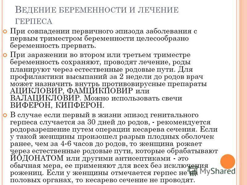 После 14 недель беременности при возникновении генитального герпеса возможно лечение противовирусным препаратом ацикловир. После 22 недель возможна терапия валацикловиром.