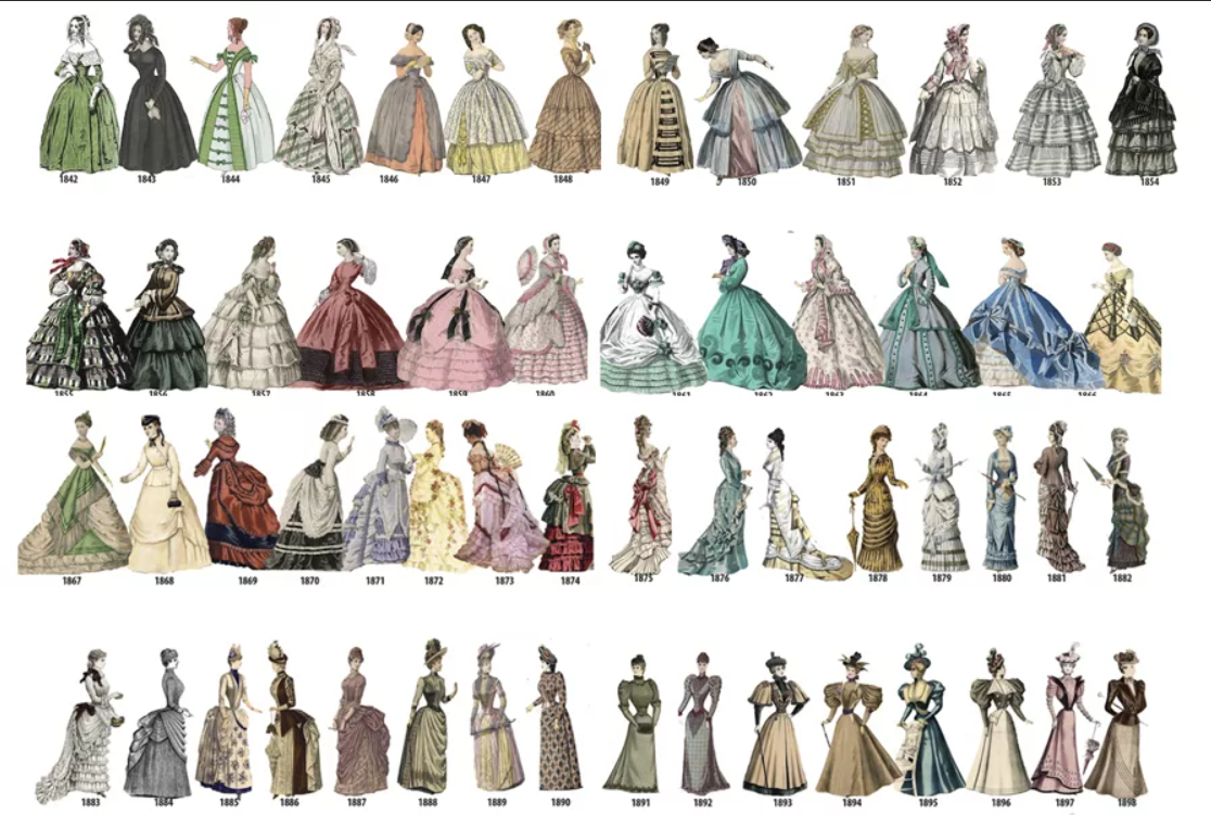 Наглядный и описательный обзор изменений (пусть даже незначительных) в женской одежде, похожий на учебник.