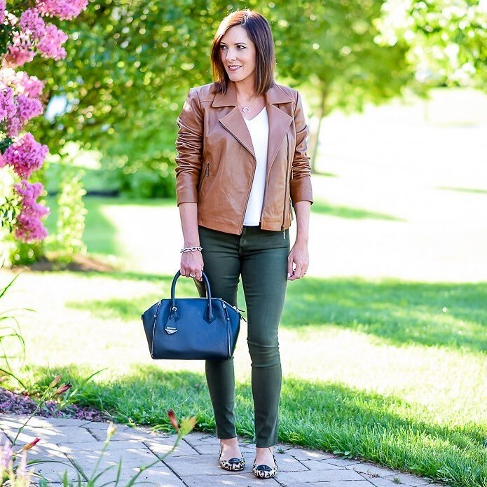 - Джинсы + топ + кожаная куртка