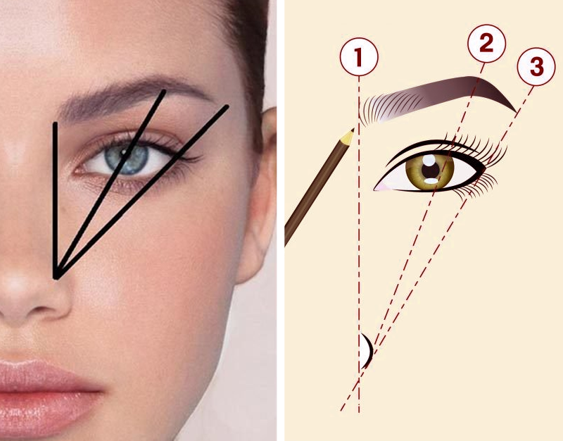 Начало брови определяем следующим образом: прикладываем начало карандаша к крылу носа, и продолжаем эту линию через уголок глаза. Точка пересечения карандаша и брови и будет точкой ее начала;