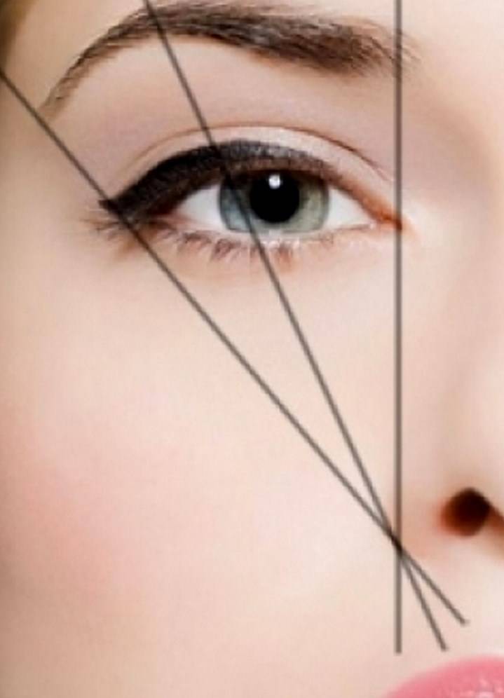 - Проведите линию от крыла носа к внешнему уголку глаза — здесь должен быть кончик брови