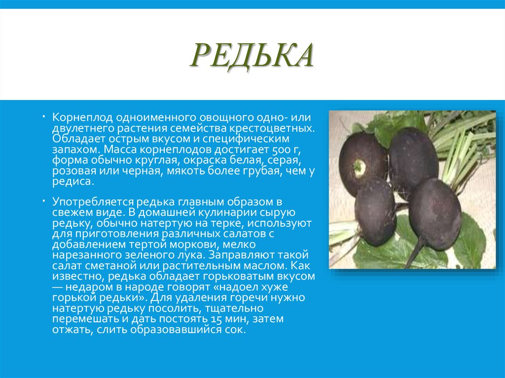 Редька известна своим характерным острым вкусом и жгучим ароматом. Это связано с содержанием в ней горчичных масел и других серосодержащих соединений.