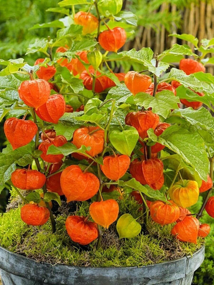 - Плоды окружены яркими оранжево-красными чашечками в форме «фонариков»