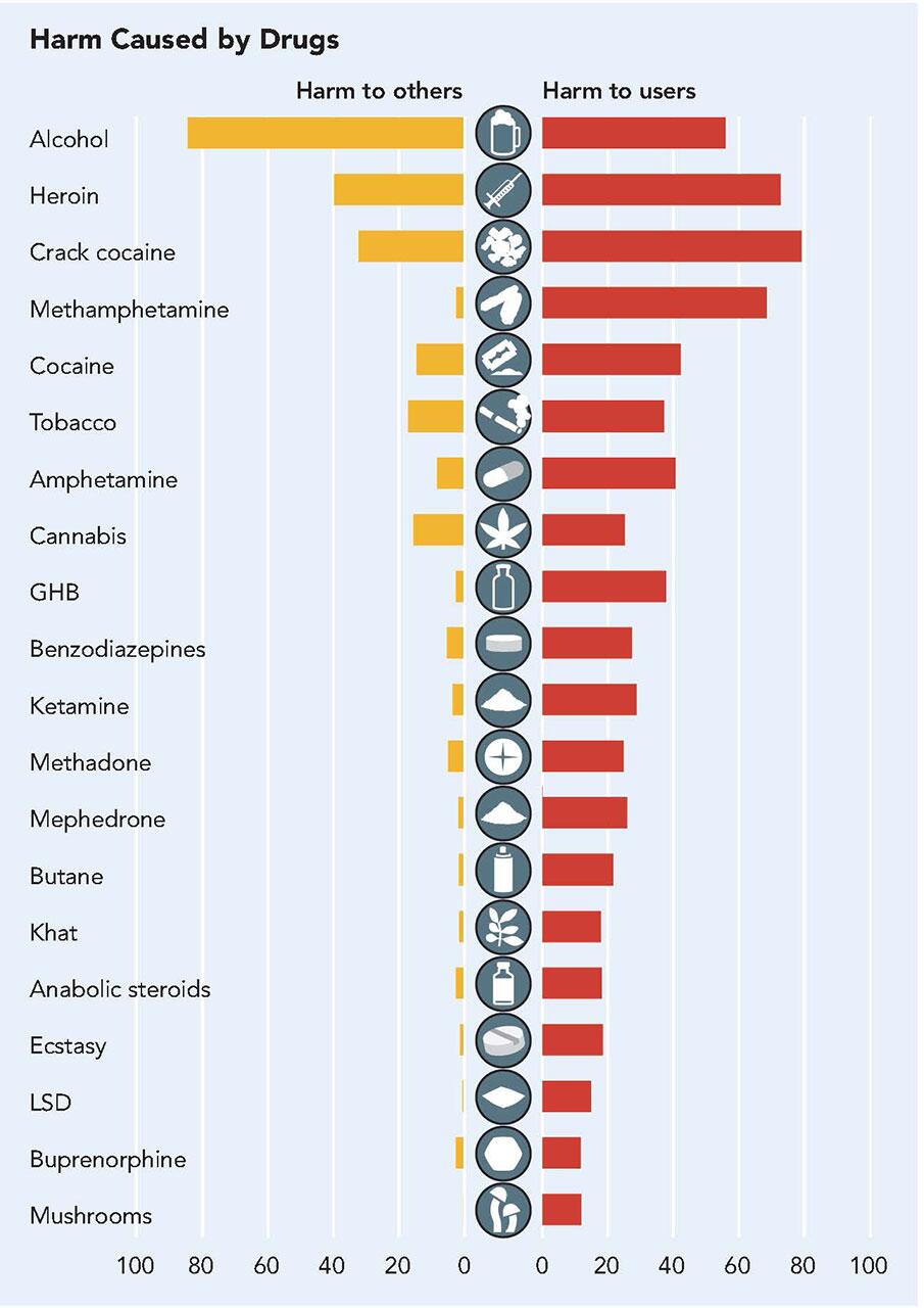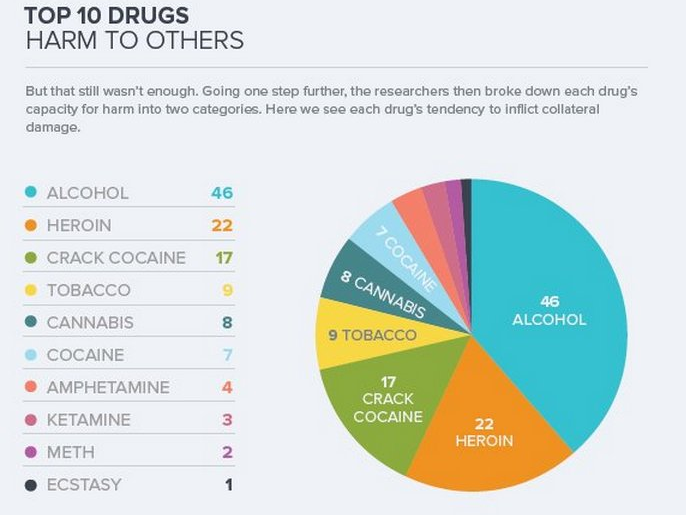 Второе место в рейтинге самых опасных психоактивных веществ занимает алкоголь. Ежегодно в США фиксируется около 88 000 смертей, связанных с употреблением спиртных напитков. При этом алкоголь, как и никотин, остается легальным и широкодоступным наркотиком.