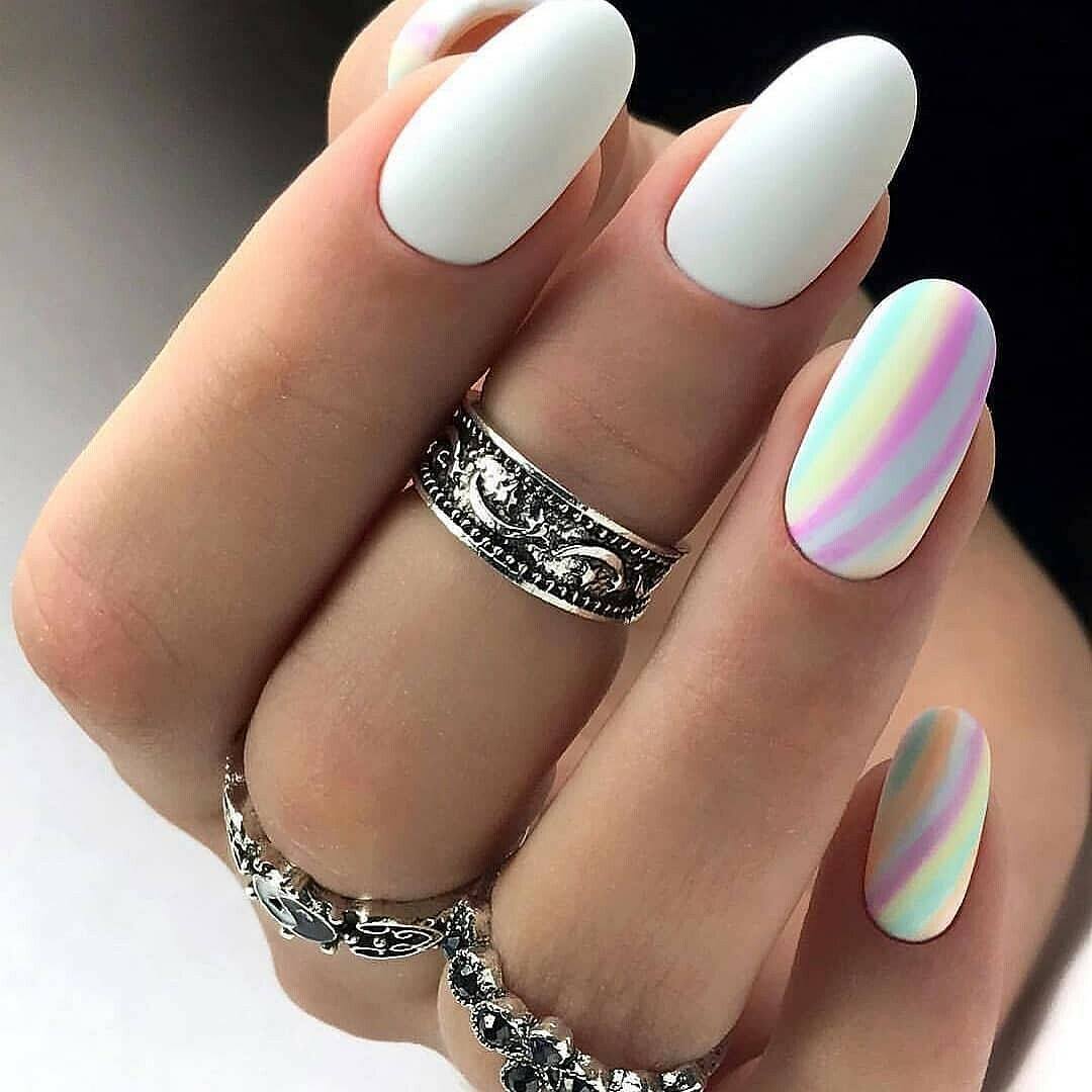Абстрактные рисунки на ногтях — еще один модный тренд 2020 года. Это могут быть геометрические фигуры, волнистые линии, цветовые пятна. Абстрактный дизайн позволяет сочетать разные техники и цвета, создавая уникальный маникюр.