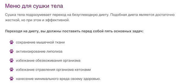 Сушка тела — это особый режим питания и тренировок, направленный на уменьшение подкожного жира и проявление мышечного рельефа. Обычно сушку используют девушки, которые уже набрали мышечную массу и хотят подчеркнуть свои формы, сделав их более четкими и рельефными.