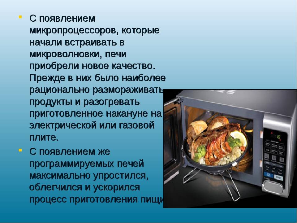Микроволновые печи нагревают пищу напрямую. Они довольно просты в использовании. Вы кладете еду в устройство, нажимаете, как долго вы хотите, чтобы она готовилась, и убедитесь, что ваша еда полностью нагрета. Есть много вариантов использования микроволновой печи. Это устройство для быстрого приготовления, используемое для замороженных блюд, остатков и многого другого. В них еда готовится быстрее, чем в обычных духовках, и нагревается только пища, а не вся камера духового шкафа.