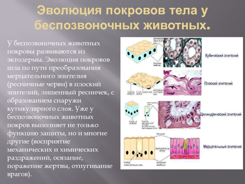 Покровы тела животных прошли длительный путь эволюционного развития от простейших одноклеточных организмов до сложноорганизованных млекопитающих. Основные этапы этой эволюции:
