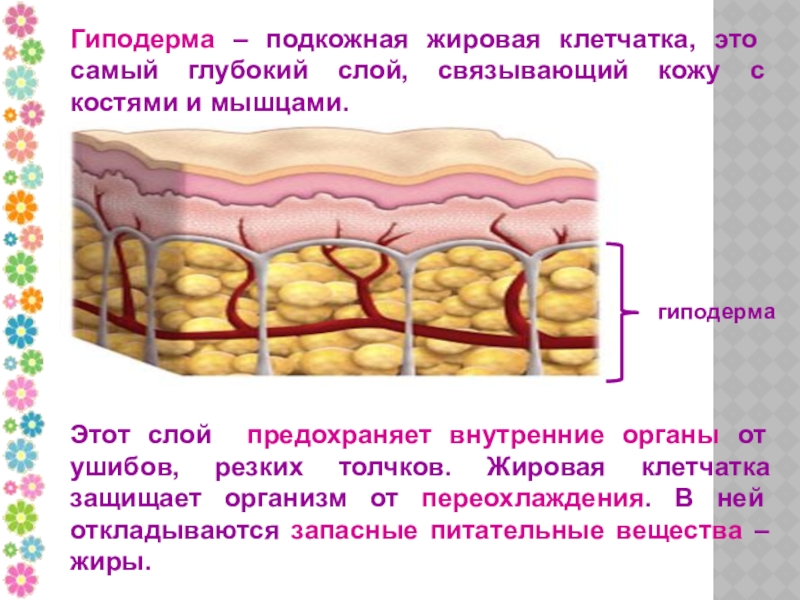 Подкожный слой состоит в основном из жира. Жир образует слой, который изолирует тело от холода и помогает поглощать удары и повреждения внутренних органов.