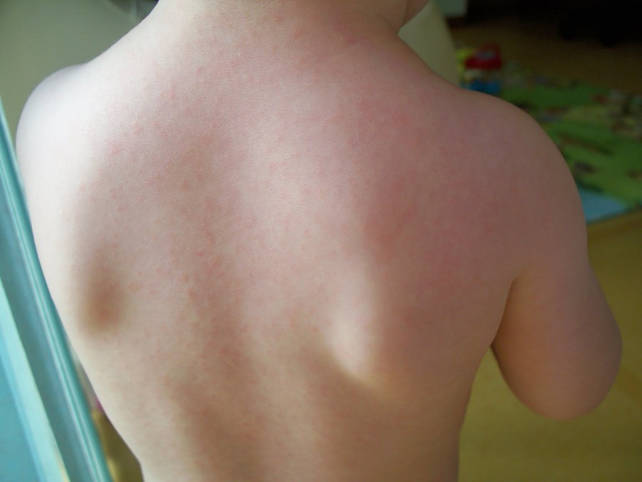 Одним из ее первых симптомов является как раз красная мелкопятнистая сыпь по всему телу с максимальной локализацией на спине, ягодицах, шее и лице. На второй день количество пятен обычно сокращается.