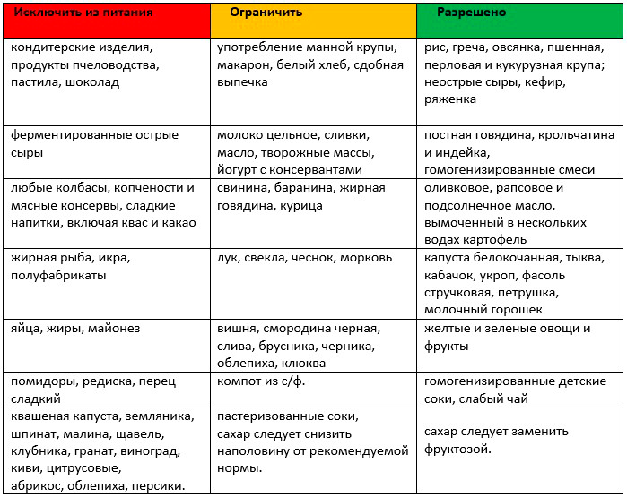 - Необходимо исключить из рациона вещества и продукты, способные вызвать появление аллергических реакций или раздражение желудочно-кишечного тракта у ребенка.