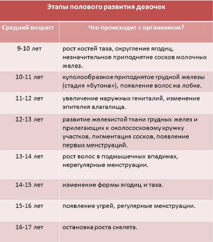 У большинства девочек половое созревание начинается в возрасте от 8 до 13 лет. Однако сроки могут варьироваться в зависимости от индивидуальных особенностей: