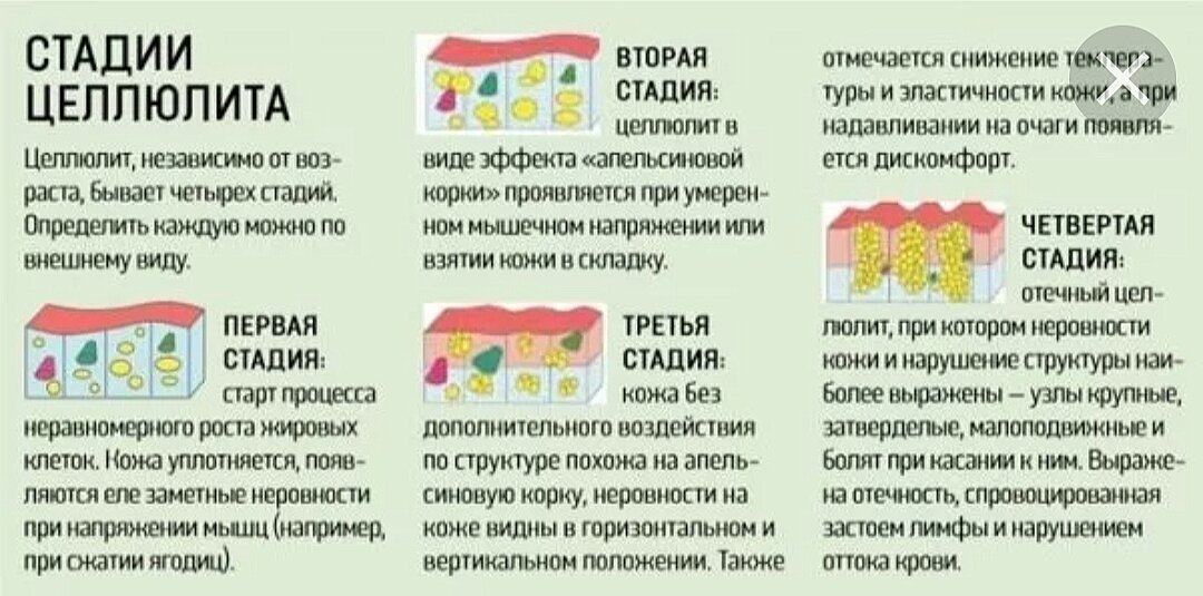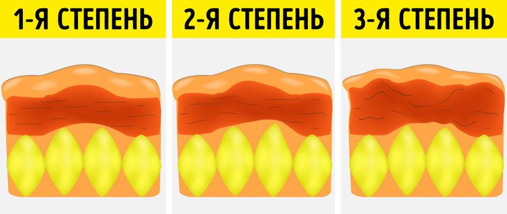Вторая стадия — появляется «апельсиновая корка» при напряжении мышц- Третья стадия — бугристость кожи видна даже в расслабленном состоянии, повышается ее чувствительность