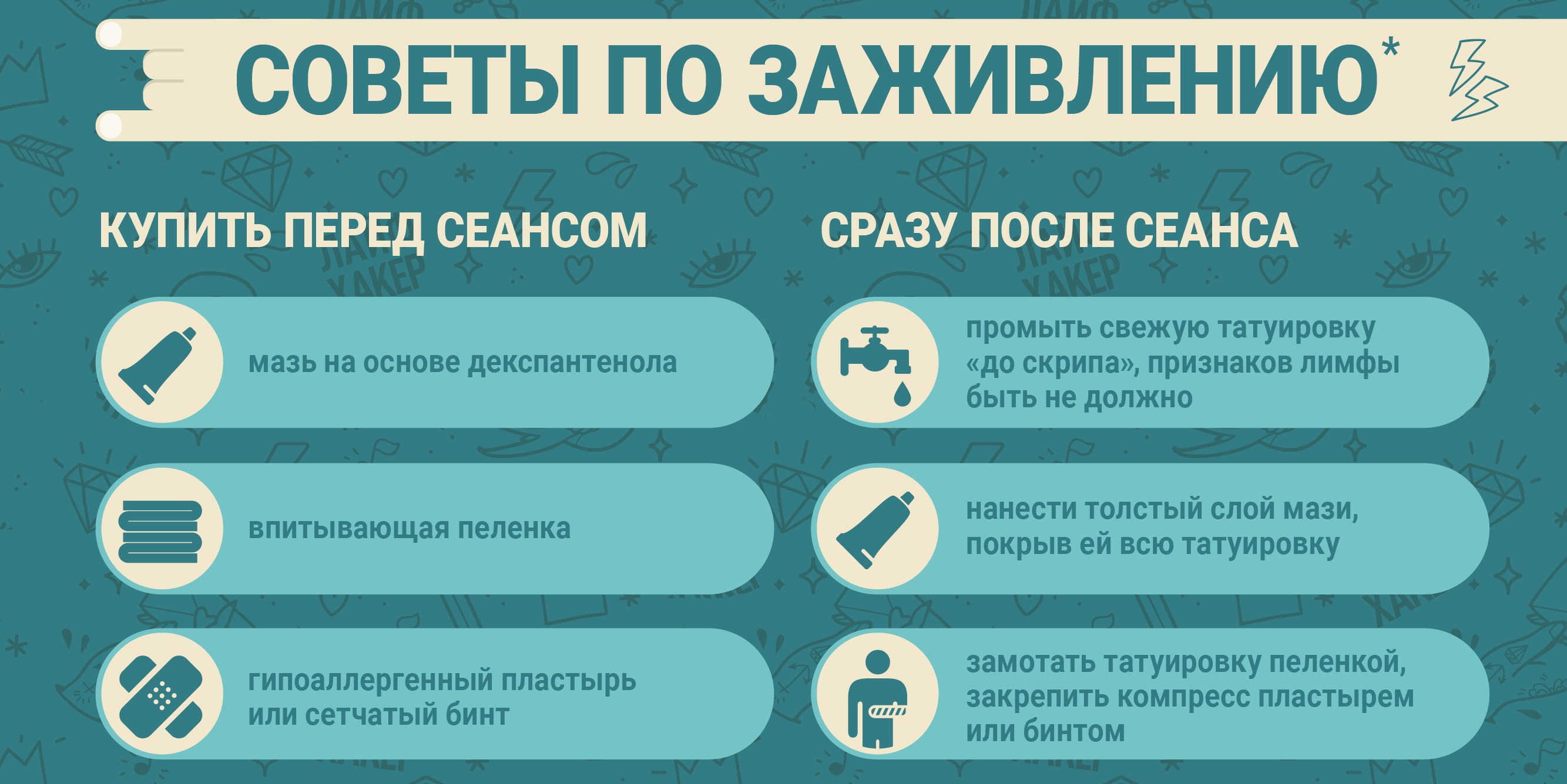 Главное правило в первые дни — не трогать татуировку. Она будет покрыта защитной пленкой, которую нужно оставить на 2-3 дня. Точное время снятия пленки уточните у своего мастера.