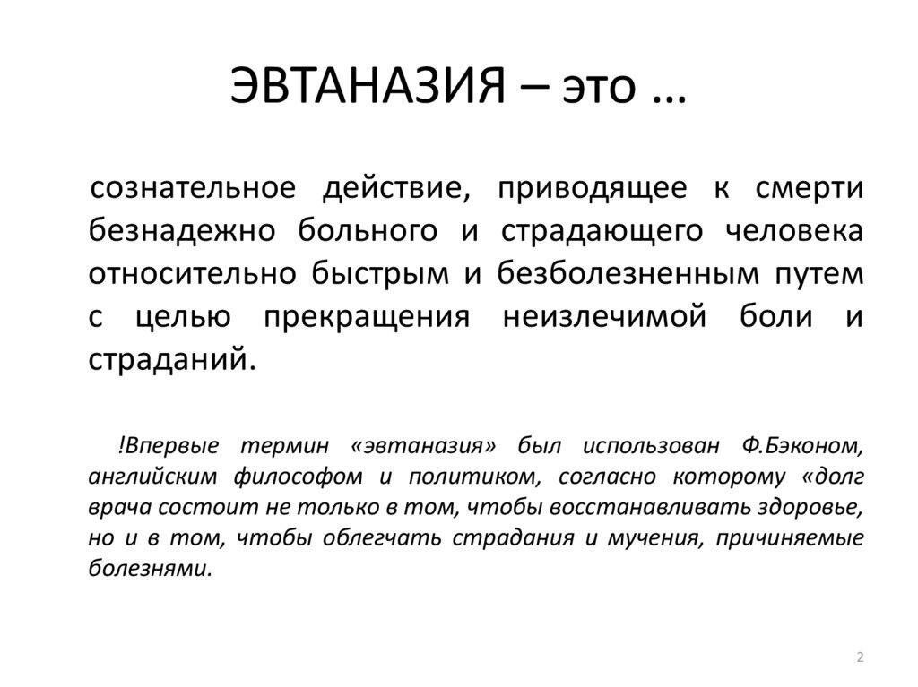 Эвтаназия — это добровольное прекращение жизни неизлечимо больного человека с целью избавления его от страданий. Термин «эвтаназия» впервые употребил Фрэнсис Бэкон в XVII веке, говоря о легкой и безболезненной смерти.