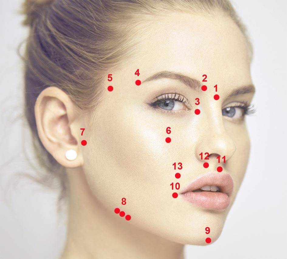 На лице расположено множество биологически активных точек, но для омоложения наиболее важны следующие: